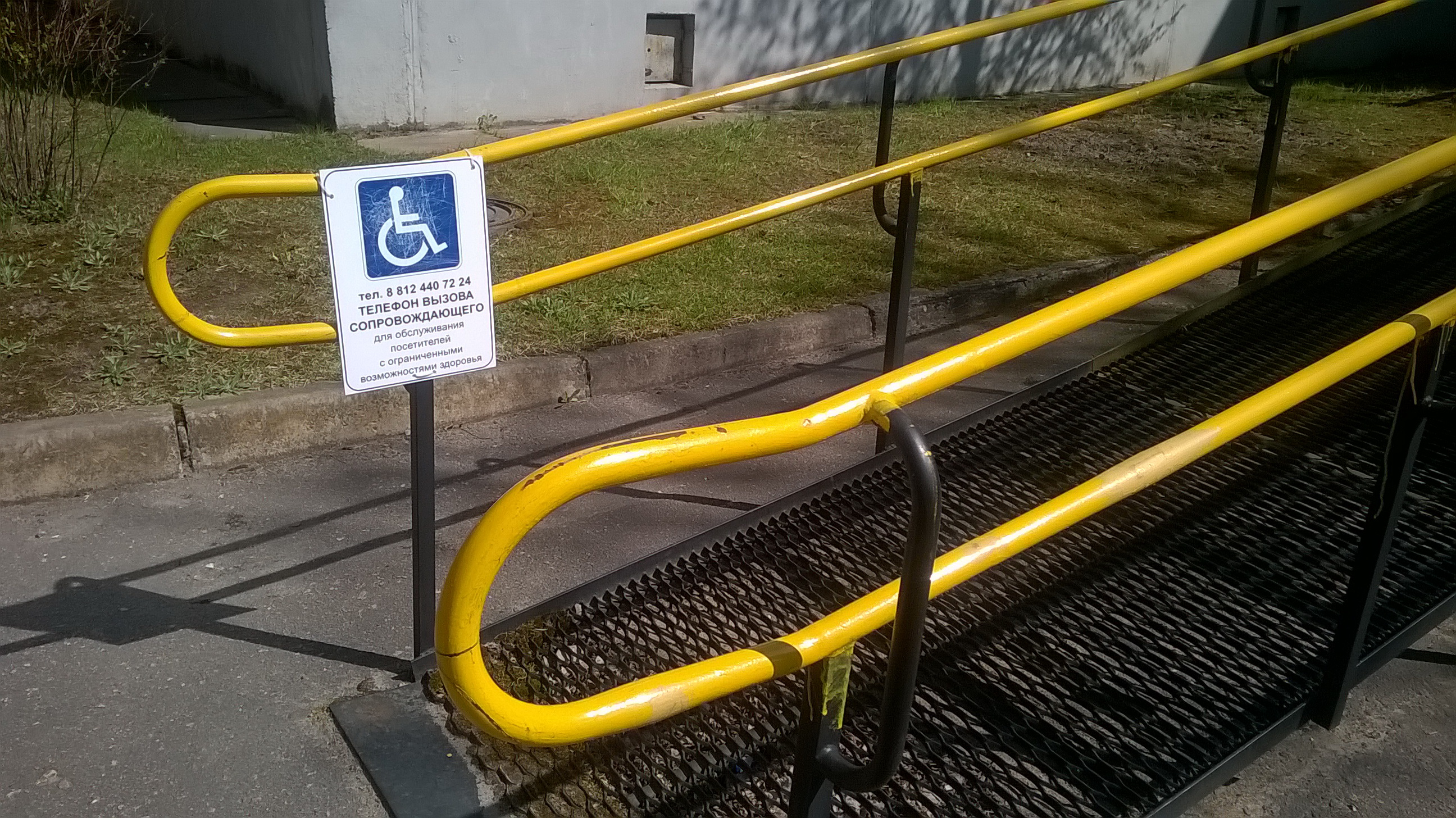 Слева на пандусе расположена информационная табличка с указанием номера телефона вызова сопровождающего для оказания помощи посетителям с ограниченными возможностями (сопровождение до места оказания услуги).